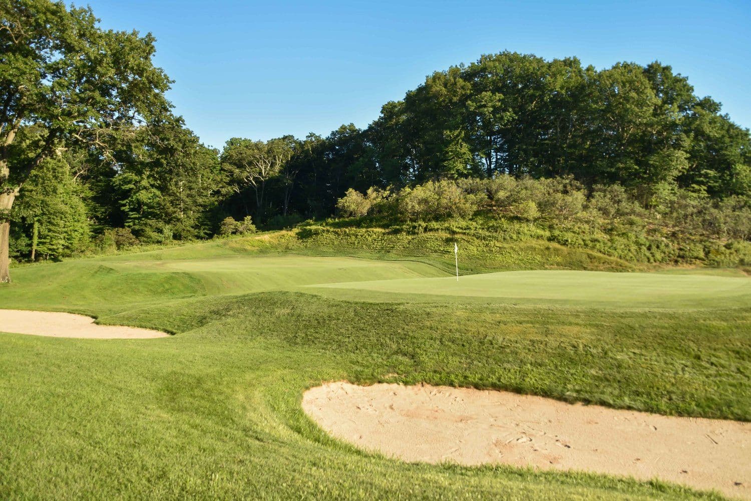 Charles Banks created one of the longest versions at Forsgate Country Club in New Jersey, stretching to 235 yards. Not taking his nickname "Steamshovel" lightly, the designer also added Raynor-style thumbprints—shallow depressions—to both of the green's flat surfaces. The most controversial element, however? His swale can be pinned.